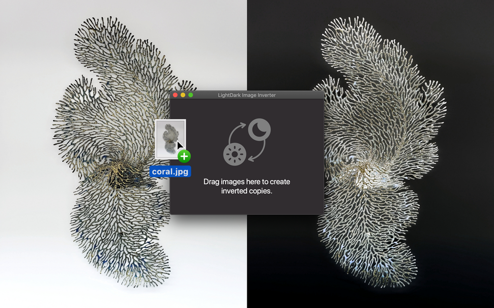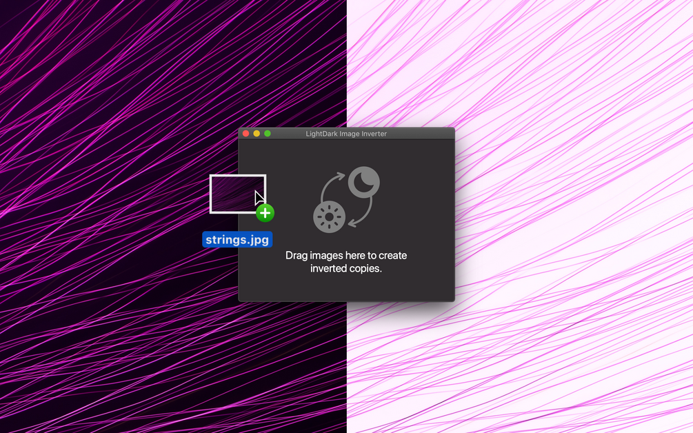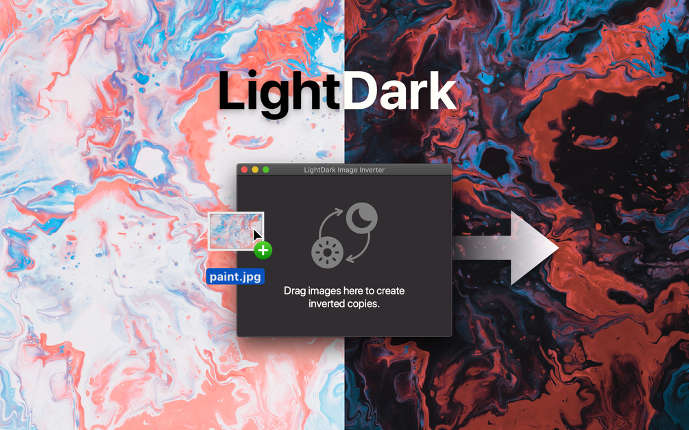 LightDark Image Inverter is great for generating a complementary dark or light themed desktop wallpaper from an existing wallpaper image. If you have a desktop wallpaper image that fits best with dark appearance mode on your OS but is too dark when using light appearance mode, you can use this app to generate an inverted desktop wallpaper image that may fit better for light appearance mode and vice versa. The app takes image files and generates brightness inverted images while preserving hue. This makes the dark parts of the image become bright and vice versa, but keeps the color hue intact.